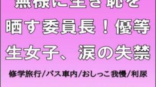 ■あらすじ修学旅行のバスの車内。学級委員長の女子生徒は、強烈な尿意に襲われていた。次第に高まってくる尿意と懸命に戦う。バスの車内では、カラオケ大会が行われていた。マイクが女子生徒に手渡され、曲を歌い終わったときに、その瞬間が訪れてしまう。■人物紹介・宮下花帆クラスの学級委員長の優等生女子。修学旅行のバスの車内で、強烈な尿意を催してしまう。必死に尿意を耐えるが、ついにその瞬間を迎えてしまう。・小島亮人宮下花帆と同じクラスの男子生徒。サービスエリアで宮下花帆が飲んでいる紙コップに、密かに利尿剤を入れる。本編:14ページ体験版:6ページ(作品の冒頭6ページをお楽しみいただけます)ノベル作品です。絵はありません。(本文5944文字)※この物語は、体験談風の創作小説です。※実在の人物・団体とは一切関係ありません。※法律・法令に反する行為を容認・推奨するものではありません。 |d_701955|無様に生き恥を晒す委員長!優等生女子、涙の失禁|