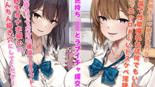 〜 1 プロローグ編 〜 約3分女子校生を買ってたっぷり誘惑される話。「食事とか買い物とかで接待して、なんて言わないから♪ 即エロいことでオッケーだよん♪」「体目当てのヤリモク大歓迎です…♪ いやらしいことだぁ〜いすき…♪ くすくす…♪」「JKを性欲丸出しの目で見ちゃうわるぅ〜い大人な人でも、媚びっ媚びのエロテクで気持ちよくしたげる…♪ くすくす…♪」〜 2 手コキ編 〜 約16分耳元で淫語囁かれながら手コキされる話。「くす♪ ほーらぁ、●●●の男子なんて馬鹿な男からぁ、私達を奪って?♪ なーんて♪ くすくす♪」「純愛ぶって学生の恋愛ごっこしてるJKにぃ、手出してイタズラしちゃお?♪ んふふー♪」「精液コキ捨て便所女扱いで当然…♪ エッロぉ〜いだけで、頭空っぽのドスケベ女なんだから…♪ くすくす…♪」〜 3 ダブルベロチュー編 〜 約16分JK2人から顔舐めされまくってぐちょぐちょにされる話。「んー?♪ そりゃあ彼氏彼女だもん♪ ちゅっ、って唇同士の軽いキスぐらいはしたことあるもん♪」「でーもぉ…くす♪ んべぁ〜〜…♪ じゅるぅう♪ んふ♪ お口の中までは味わってませーん…♪」「彼氏くんに取っておいてあるはずの大人のキス♪ お兄さんの舌で横入りして堪能しちゃお…?♪ んふ♪」〜 4 姉と求愛素股編 〜 約15分左の子とラブラブ素股エッチする話。「たまんないよねー♪ 〇〇〇の肩書でこんなエッロぉ〜い体してるなんて…くすくす♪」「仕方ないよね…♪ 体は大人顔負けにたっぷり成長してるのに、中身は無防備で頭のわるぅ〜いまま…♪」「人生経験浅くてぇ、惚れやすいJKのエロメスをオナホ代わりにセフレとしてキープ♪」〜 5 姉とセックス編 〜 約16分彼氏持ちのドスケベJKとセックスして中出しする話。「…ね?♪ お行儀の良い優秀な女子校生をぉ、お兄さんのお、な、ほにぃ…してぇん…♪」「ドスケベ女♪ エッロいド淫乱JK…♪ 〇〇〇の癖におまんこエロ過ぎ…♪ セックス上手(うま)すぎる…♪こんなエッロぉ〜…いオナホ女、●●●の男子にはもったいないよね〜…?♪ くすくすくす…♪」「あんっ、だめ、だめだめぇ♪ セックスにドハマりしてるわるぅ〜い女子校生だってバレちゃうぅ…♪」〜 6 妹とセックス編 〜 約14分彼氏よりお兄さんの方がいい、と言わせながらセックスする話。「こーんなとろとろの気持ち良すぎるおまんこしてたらぁ、男は絶対自分のものにしたがるに決まってる♪ほら見てこのメス顔♪ 現役JKラブドール♪ 無料生オナホ扱いのおちんちん扱き女…ですよー♪」「ぉ、おっおっ♪ も、もうっ、どうせこれを言わせたかったんでしょ?♪ んっ、あっ♪こっちっ♪ お兄さんの方がいいっ♪ こっちの方が好きっ、好きすきぃ♪ おちんちん気持ちいいぃ♪」「あっ、だめだめだめっ♪ 私もいっちゃうぅ♪ こんなイキ方させられたらぁ、好きになっちゃう、好きになっちゃうからぁ♪」〜 番外編 グラビアごっこ編 〜 約17分「エロかわ美少女顔、つんと澄ましながら俺のちんぽガン見されてるって考えるとめっちゃ濃いの出る…らしいよー♪ くすくす♪」「知ってますか?♪ 遺伝子的に相性の良い男女は良い匂いがするんですって♪」「くすくす♪ だったらぁ、私達ってどの男子とも相性バツグンってことじゃん…♪」〜 番外編 オナホでちゅまちエッチ編 〜 約16分〜 番外編 いけいけ連呼&ぴゅっぴゅ囁き編1 〜 約2分〜 番外編 いけいけ連呼&ぴゅっぴゅ囁き編2 〜 約2分〜 番外編 ダブル鼻息耳舐め編 〜 約8分〜 番外編 ぶちゅきすバキュームスタンプオナニー煽り編 〜 約7分〜作品概要〜総再生時間2時間15分台本付属 効果音無し音声付属CV:涼花みなせ様イラスト:弱電波様編集協力:すとろぼ |d_368162|援交JKツインズ! 4組目! 〜彼氏持ち姉妹とラブイチャ濃厚密着エッチ!〜|